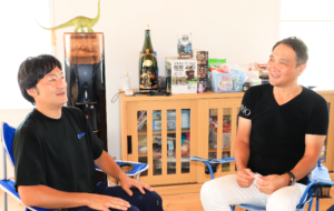 月刊誌アンカーの取材で元WBA世界ミドル級チャンピオンの竹原慎二さんと談笑する加賀妻英樹代表